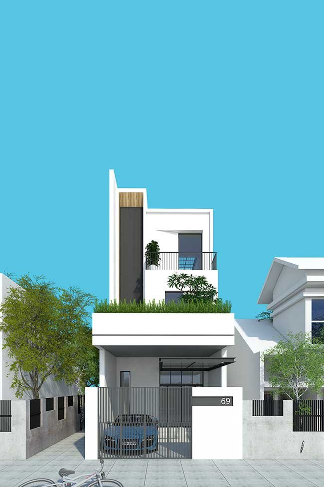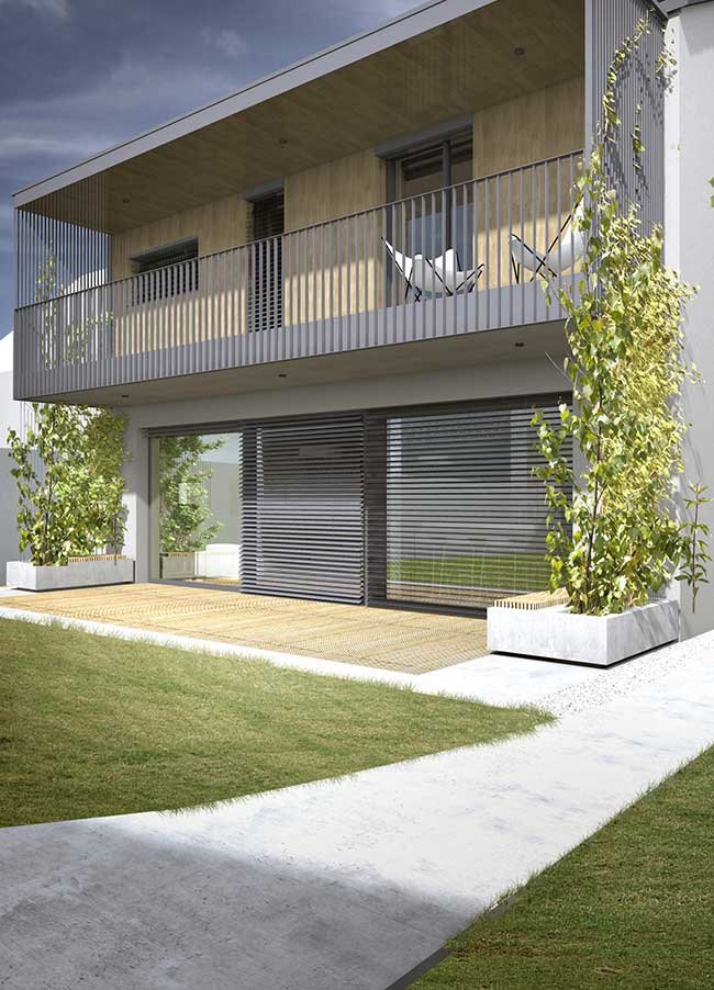 - Metal em pintura branca: Fachadas se destacam bem em sobrados. Aproveite a textura cinza do metal para explorar tintas fortes de contraste. Neste caso foi usado o branco, mas veja como o verde também ajuda.
