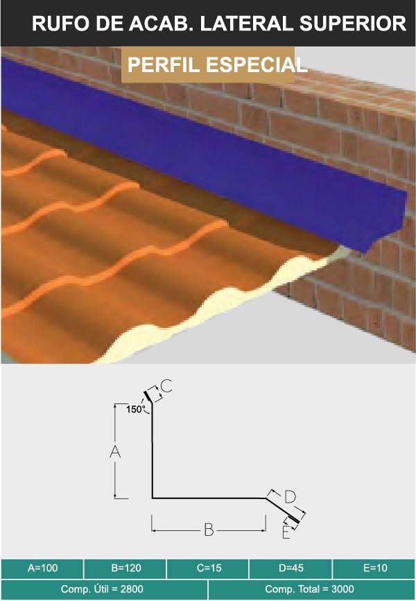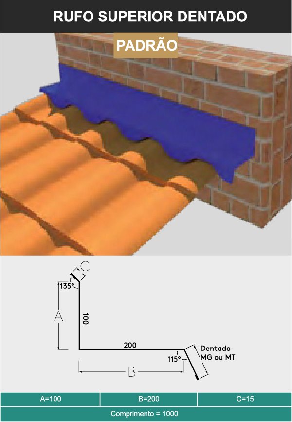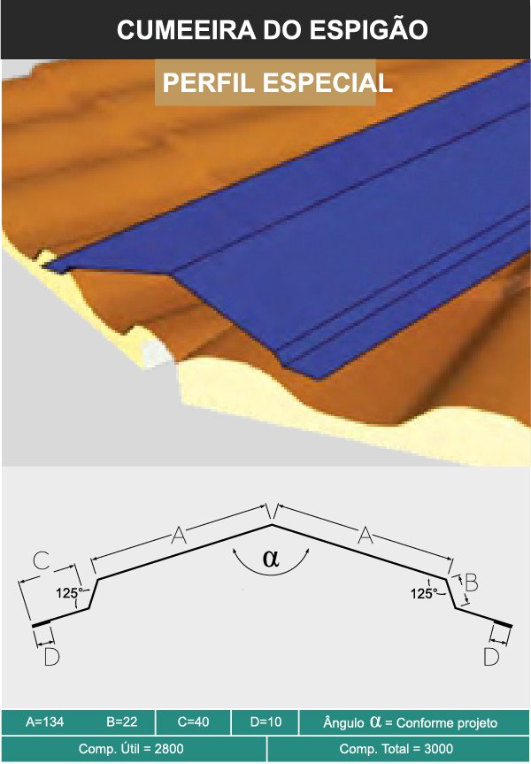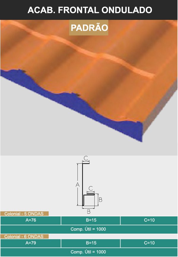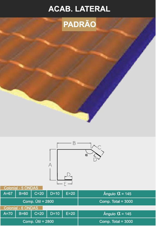 Espessura #0,43 mm (superior) #0,38 mm ou #0,43 mm (inferior) (Conforme normas ABNT-NBR 7013 e ABNT-NBR 7008), face superior cromatizada com primer poliéster (4 a 6 microns), acabamento com pintura em poliéster texturizado Crinkle (18 a 22 microns) e face inferior cromatizada com primer poliéster (4 a 6 microns).
