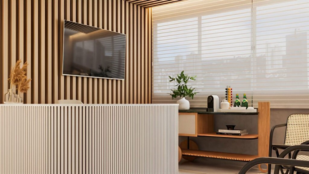 A madeira é altamente versátil em termos de design, podendo ser personalizada em diferentes tamanhos, formas e orientações das ripas, o que permite a criação de padrões e efeitos visuais únicos. Além disso, a madeira pode ser facilmente combinada com outros materiais, como vidro e metal, para criar contrastes e detalhes interessantes.