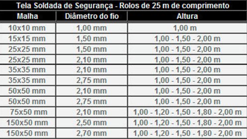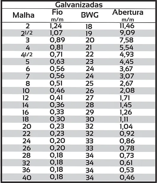 - Tabela de telas galvanizadas