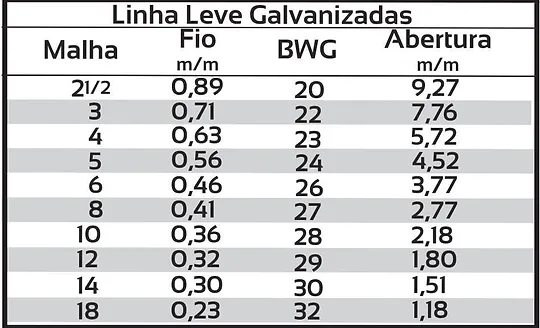 - Tabela de telas galvanizadas (linha leve)